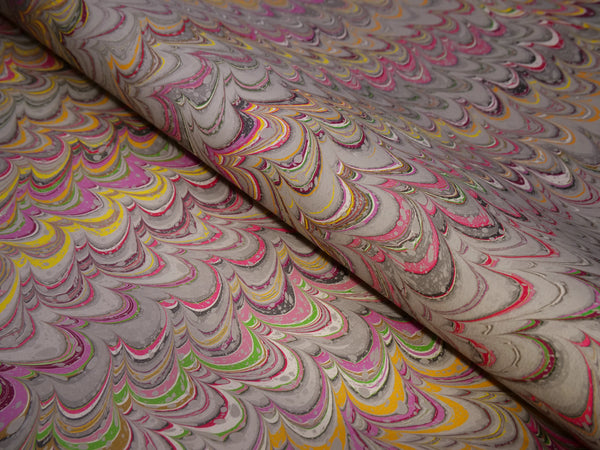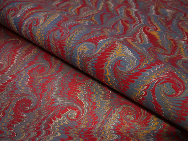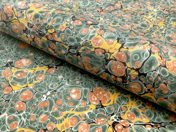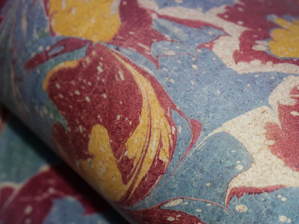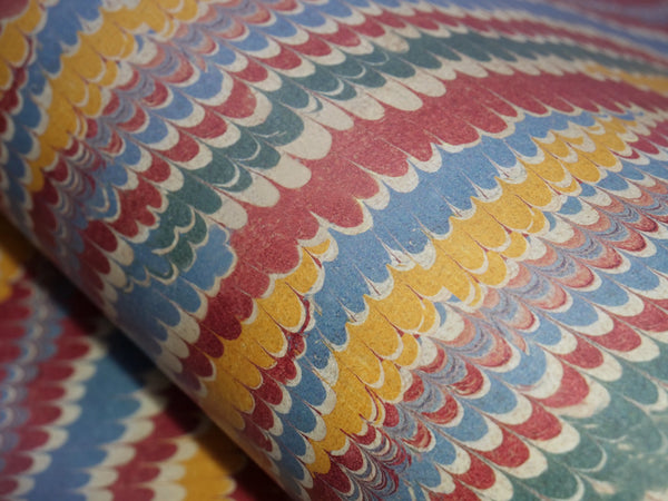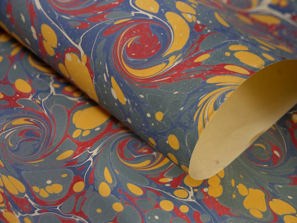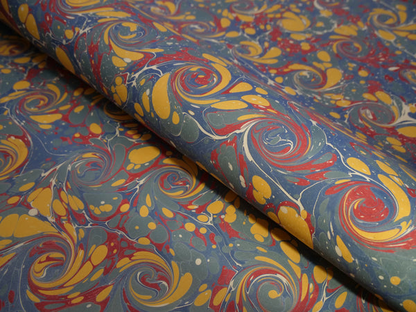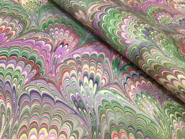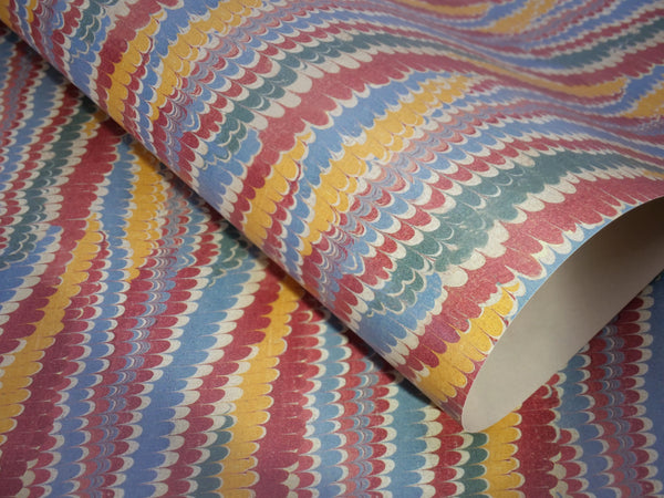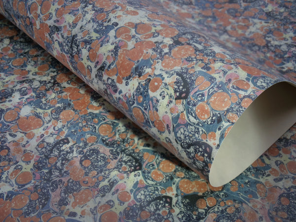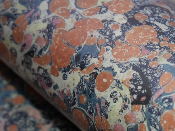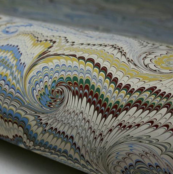 A collection of traditional hand marbled papers, made in Scotland by Kate Brett of Payhembury Marbled Papers. Through several centuries, people have been using marbled papers as part of art and craft projects. With care and skill patterns are matched but part of their charm is that each print is absolutely unique. Since 1982 Payhembury Marbled Papers has specialised in trying to reproduce some of the old marbled paper patterns in the traditional manner, floating water-based paints on a size made from carragheen moss which is then carefully transferred to an absorbent surface of paper. Traditional papers were often highly polished with beeswax and an application of 50% beeswax / 50% white spirit on the papers before use is recommended (although not essential). This enhances the colour as well making them more durable.