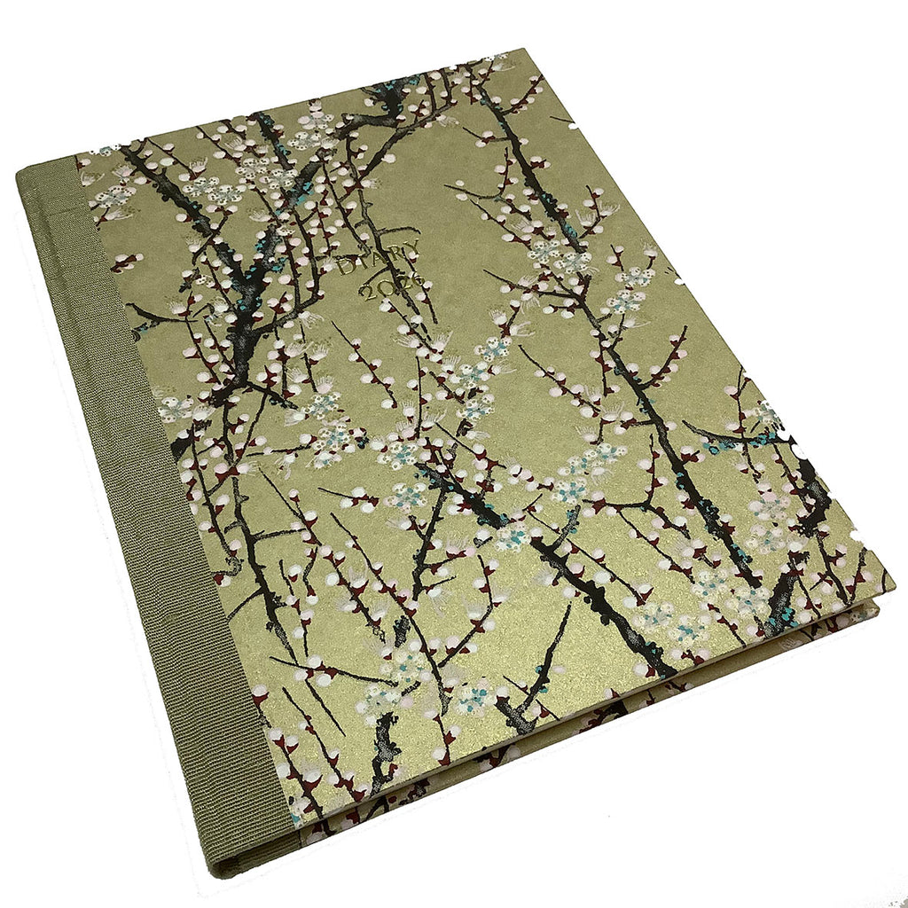 Beautifully bound in Japanese hand screen-printed Chiyogami paper with a silk cloth spine, grosgrain ribbon marker and gold tooling to the front.