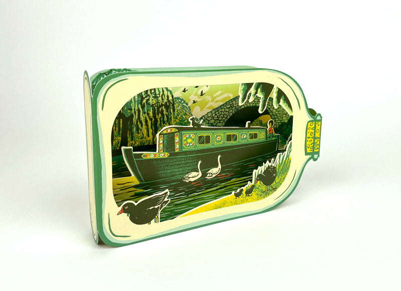 A 3D pop out card by Tom Jay of a canal boat in a bottle.