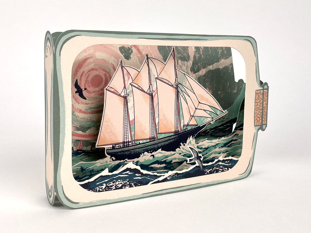 A 3D pop out card by Tom Jay of a Schooner in a bottle.