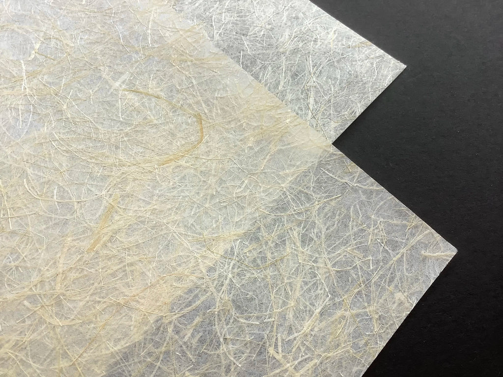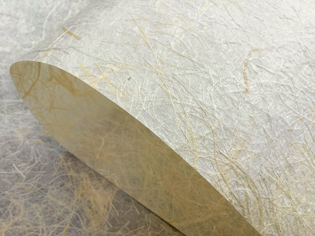 A decorative textured paper made by hand from Mulberry and gampi fibres.