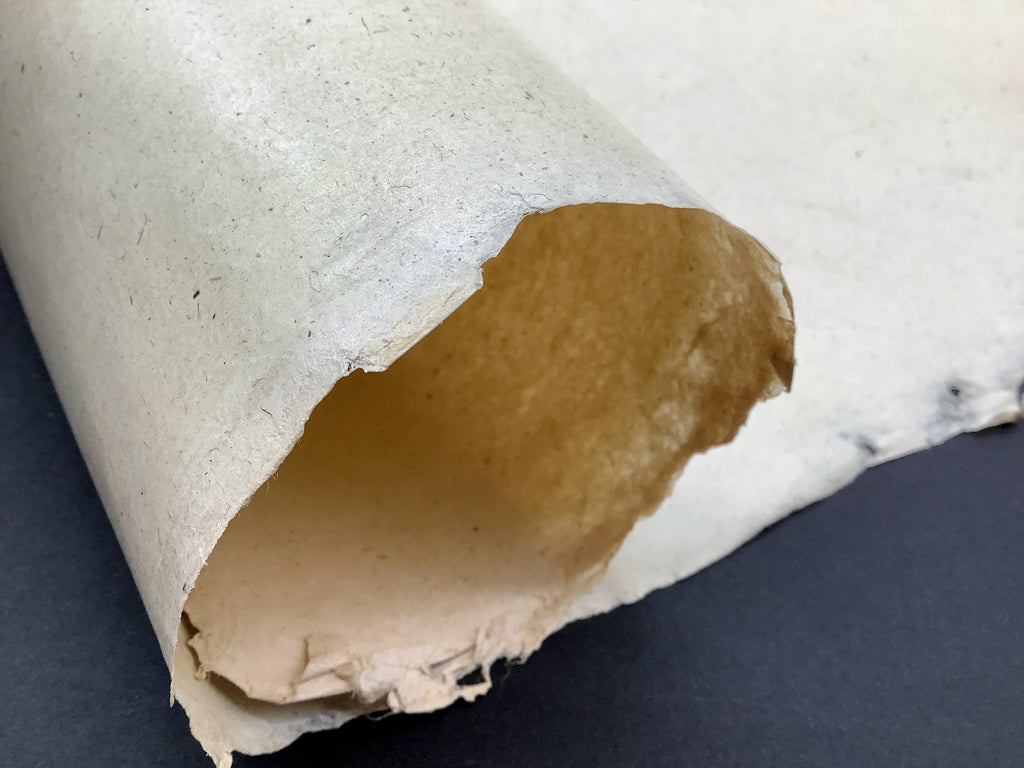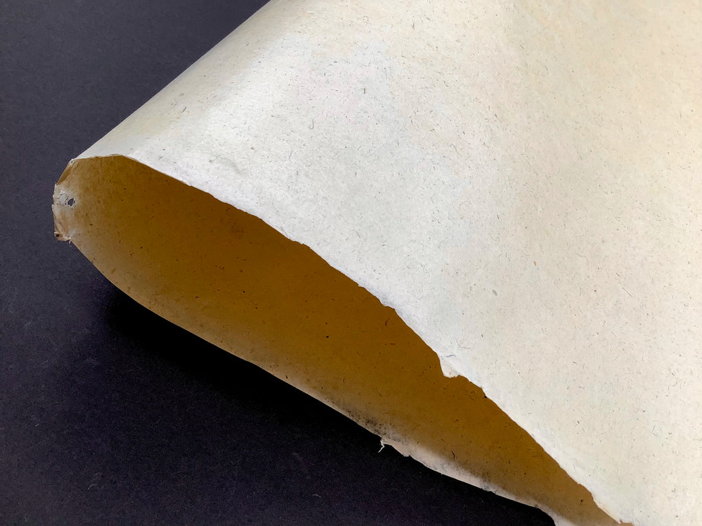 Traditional Islamic paper from North India made from raw sunn hemp fibre. Handmade on a chapri, a grass stem screen, the impression of the screen is visible on the sheet as a laid pattern. Sheets are dried on a plaster wall and surface sized with wheat starch. The paper is pressed between zinc sheets to make a smooth surface and then hand burnished with a smooth agate stone. The surface is coated with an egg tempera preparation and burnished again to make a mirror-like smooth finish.