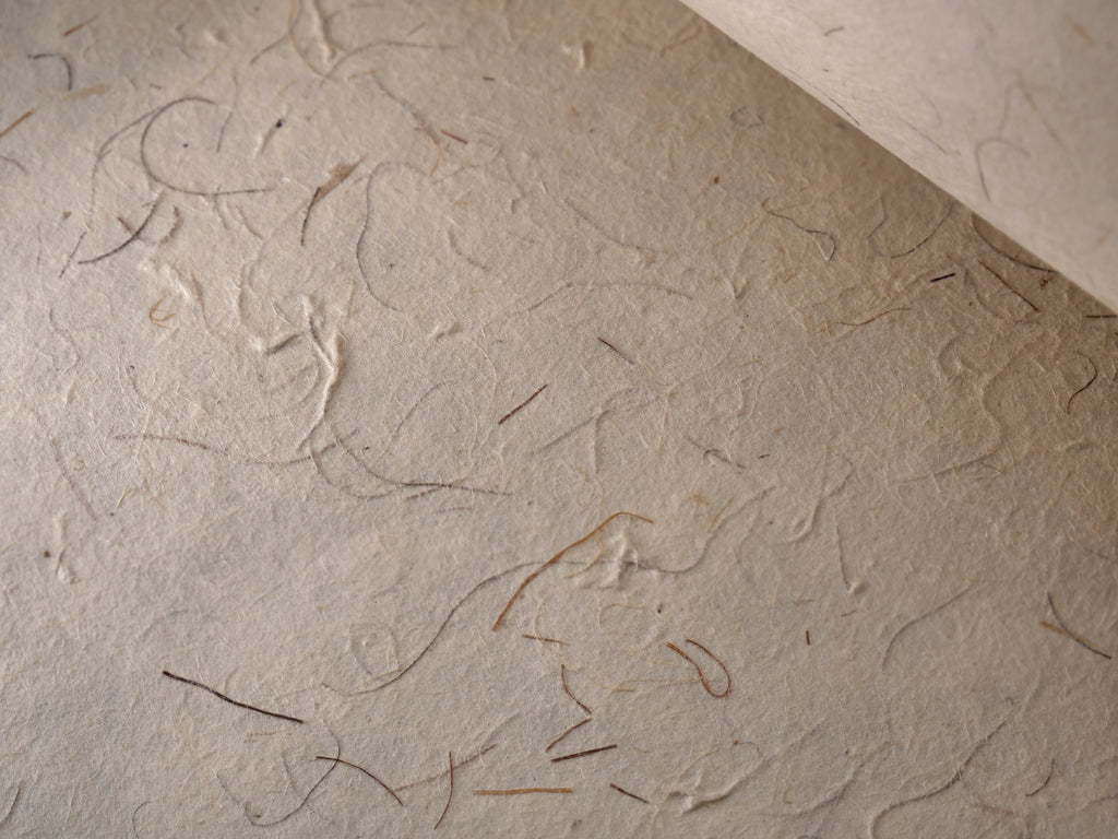 Textured, hand-made deckle-edged paper with strands of corn hair. Produced from the fibres of the lokta shrub, a plant indigenous to the high mountains surrounding Kathmandu, Nepal. Lokta is an excellent sustainable and renewable resource.