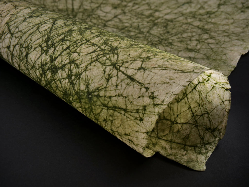 Coated in wax and dyed in Nepal this handmade lokta paper has a slightly translucent all over crackle dyed batik effect.