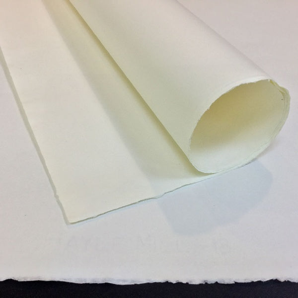 An off white handmade cotton rag watercolour paper, hot press with 4 deckle edges and watermarked.