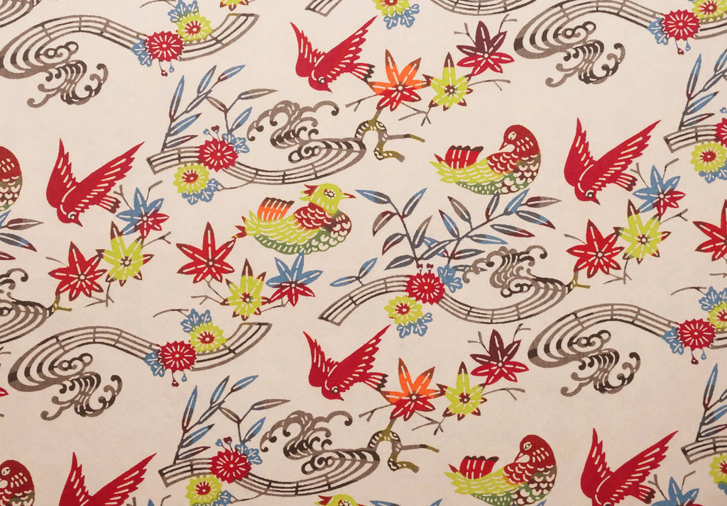 These elegant, boldly-patterned papers are made entirely by hand and are time-consuming to produce. The base paper is first treated with soy juice to allow the pigments to bind with the paper. A resist paste is printed through a hand-cut stencil onto the treated paper and allowed to dry before the soy-based colours are stencilled on. After these colours, too, have dried, the paste resist is washed off to reveal the white, or paper-coloured areas of the pattern. The strength and ageless beauty of these special papers makes them great for book covers and boxes, cards, collage, lampshades and more.