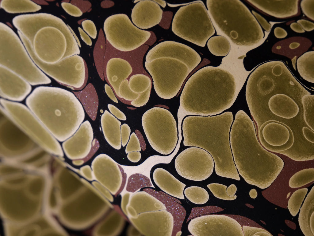 An olive green and brown French shell pattern, hand marbled in Brazil. All rights reserved ©