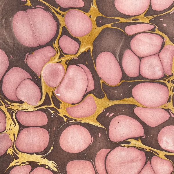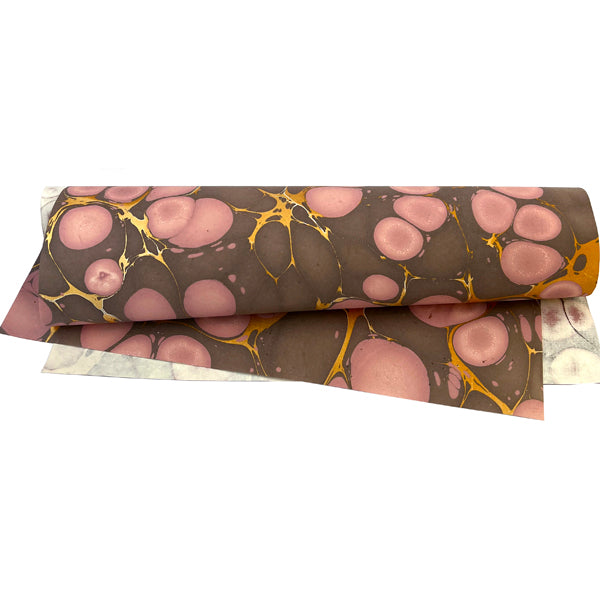 Beautiful subdued colours, a touch of gold, with lots of movement and exuberance. These handmade papers are made using the ancestral technique of vat marbling.