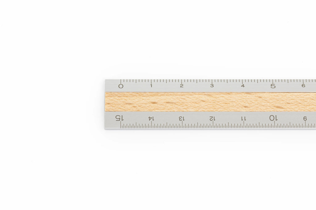 A 15cm aluminium & beech ruler - engraved in black with metric increments.