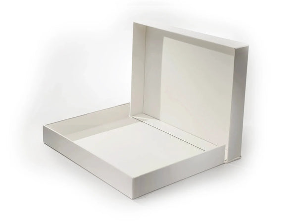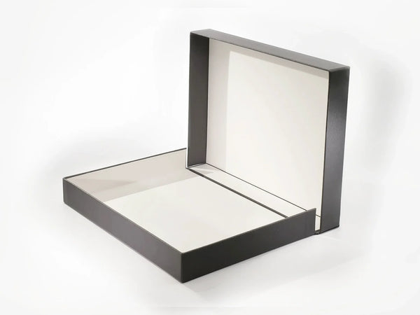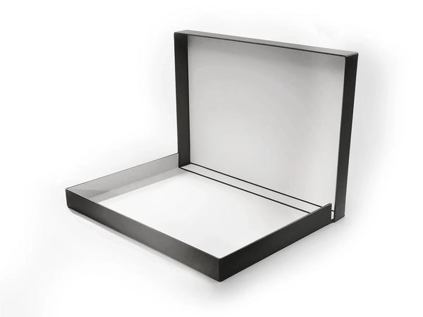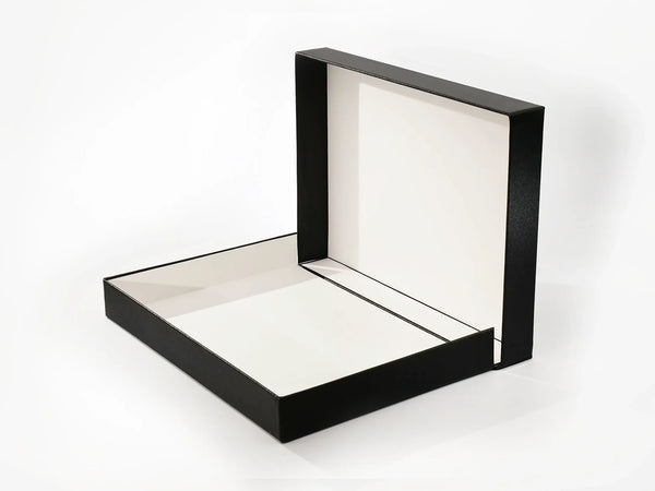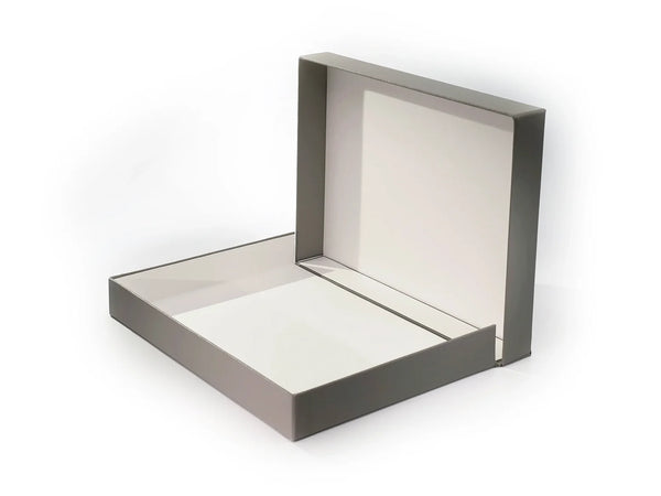 Made entirely of acid-free materials, these clamshell boxes are very popular as safe document storage or presentation portfolios for art works. Covered in super durable buckram they can be wiped clean. They are oversized A4 & A3 to accommodate the use of our clear archival document storage sleeves (A4 Ref: APS08 / A3 Ref: APS15). The drop back design enables the boxes to lay completely flat when open and allows comfortable access to the contents.