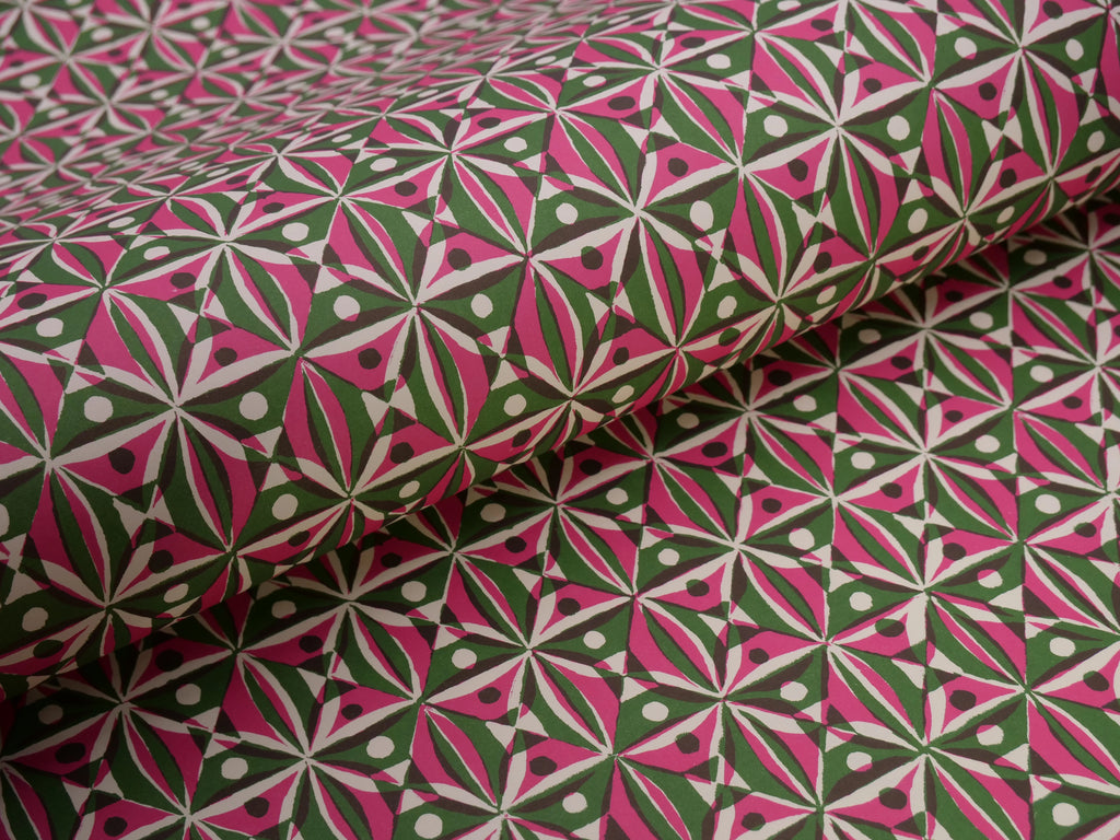 Simple hand-stencilled screen-printing is used to create the original designs, and then spot-colour lithography to replicate that studio process in manufacturing the final paper product. The result is a matte paper of unparalleled intensity and clarity of colour.