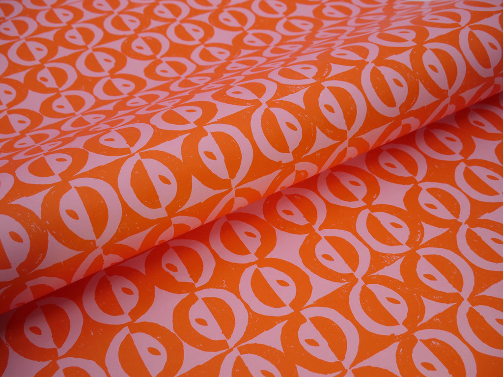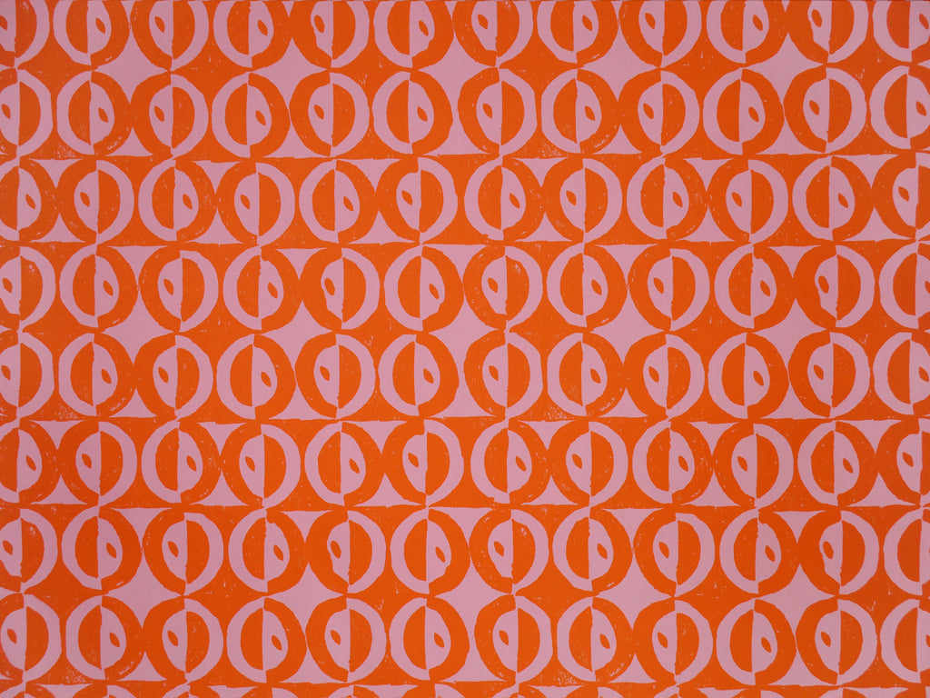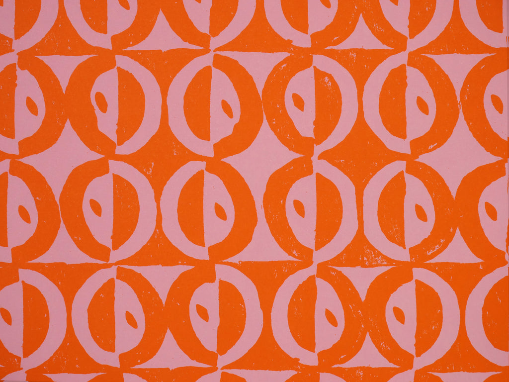 Circles and Dots is one of eight papers published by Cambridge Imprint in 2021 that recreate the patterns of the great designer, printer and educator Peggy Angus. Peggy Angus was a friend of Eric Ravilious, Tirzah Garwood, Edward Bawden and many other key figures in British art, illustration and design, who were active in the middle years of the twentieth century. She is particularly well known for her patterns which were used to decorate tiles and and to create the beautiful wallpapers that she block-printed herself by hand. To produce this pattern, a new print was taken from Angus’s original linocut. The pattern was then reproduced lithographically in matte colour, using colour ways of the sort she most favoured, and reducing the scale to suit this new medium.