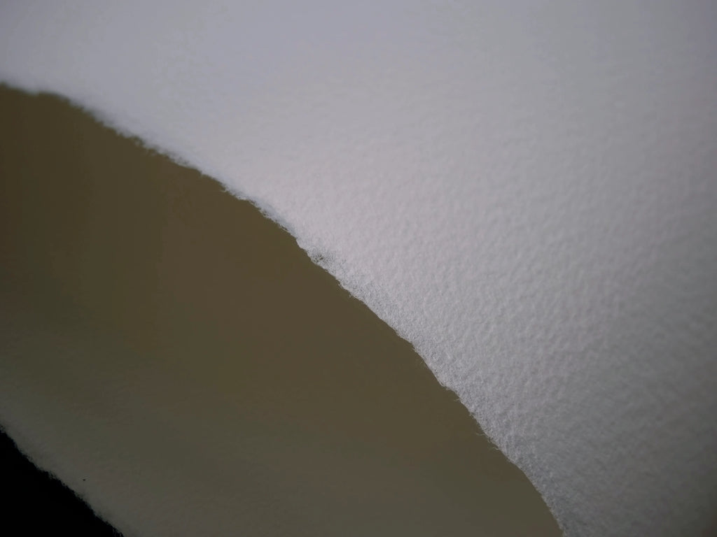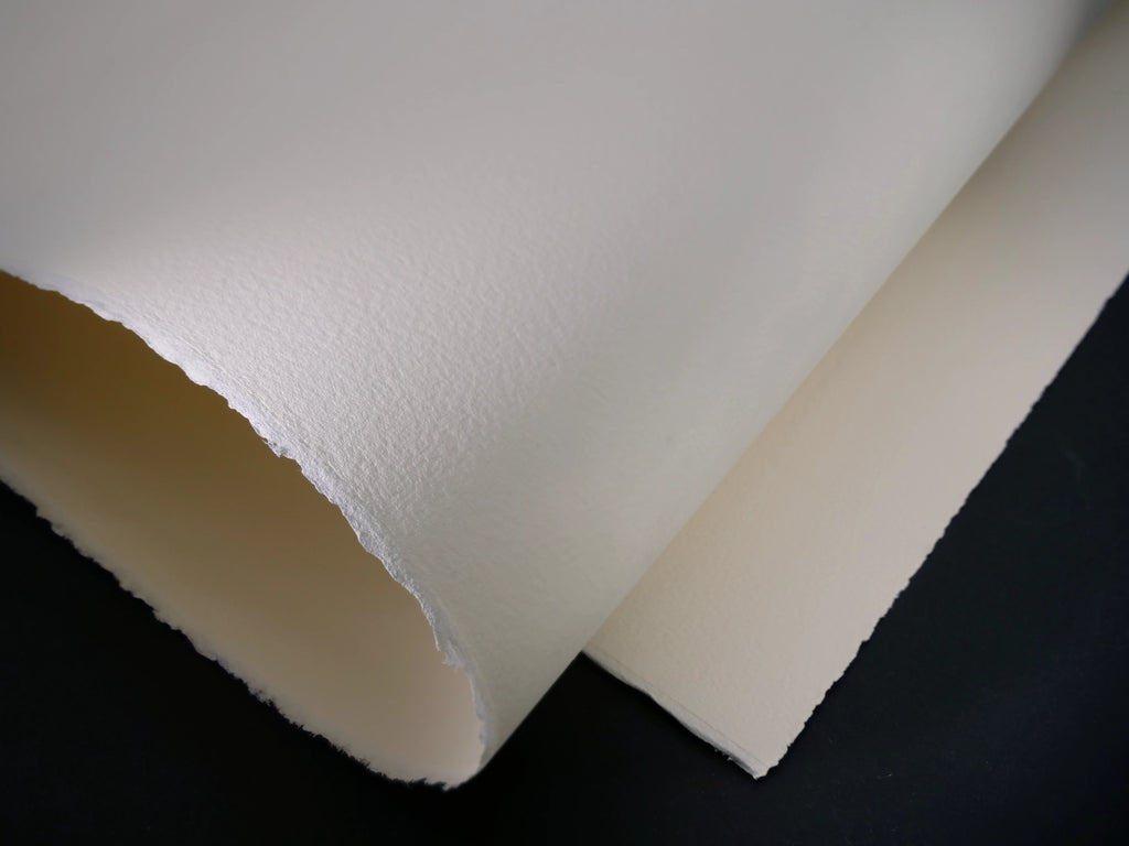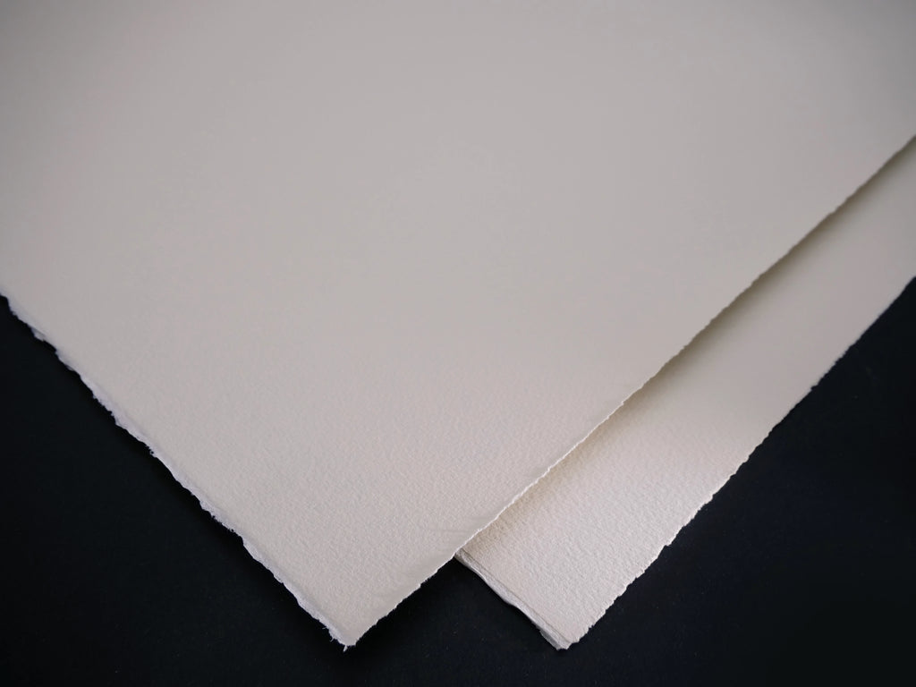 Traditional mould-made printmaking paper suitable for wide variety of traditional printmaking techniques. Four deckle edges, natural wool felt texture, internally sized, surface made to be slightly absorbent to ensure ink adheres to sheet. Handle paper by edges, avoid touching surface due to be printed. Surface most vulnerable when wet and should be handled with care