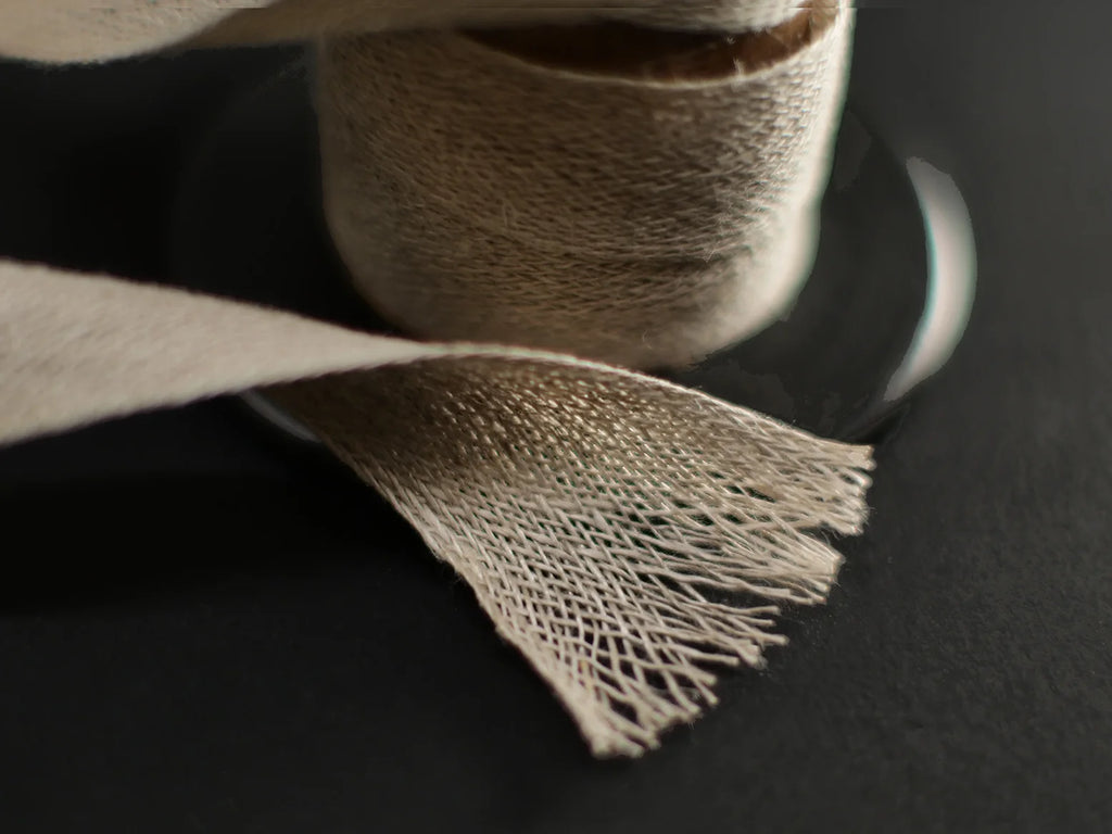 A range of fine 100% linen tapes for sewing. Unlike conventional sewing tapes, the ends can be frayed and twisted to form cords which can then be laced on to the boards in the traditional way.
