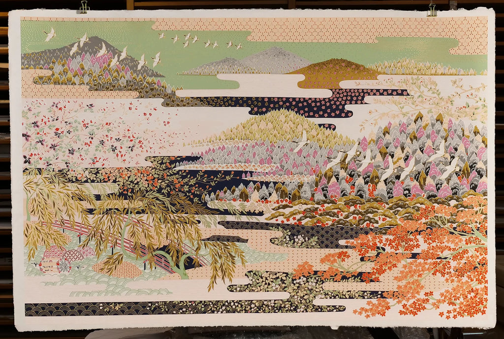 Each colour is applied with a separate screen skilfully registered one on top of the other onto a traditional Kozo paper.
