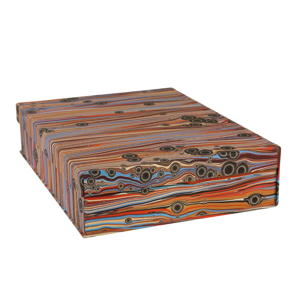 A box file to house A4 documents covered in a beautiful hand marbled paper from Brazil.
