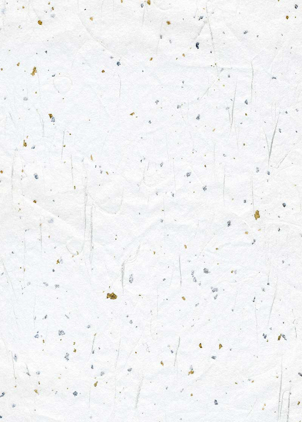 A white tissue stippled with flecks of metallic silver and gold and thicker strands of rayon swirled throughout. Great for wrapping, collage, layering and relief prints, stationery interleaving.
