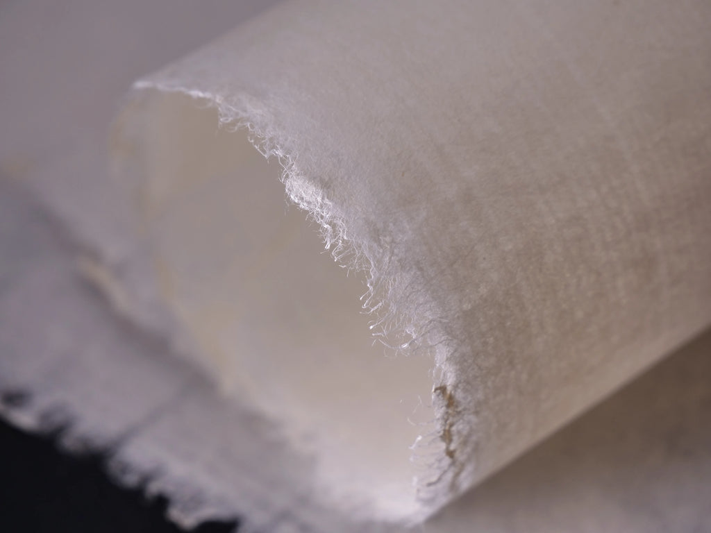 This paper has a very specific use in Japan as the middle layer in scrolls. Fibre cooked in wood ash treated water, hand beaten - made with Noriutsugi formation aid & clay, dried on wooden boards.