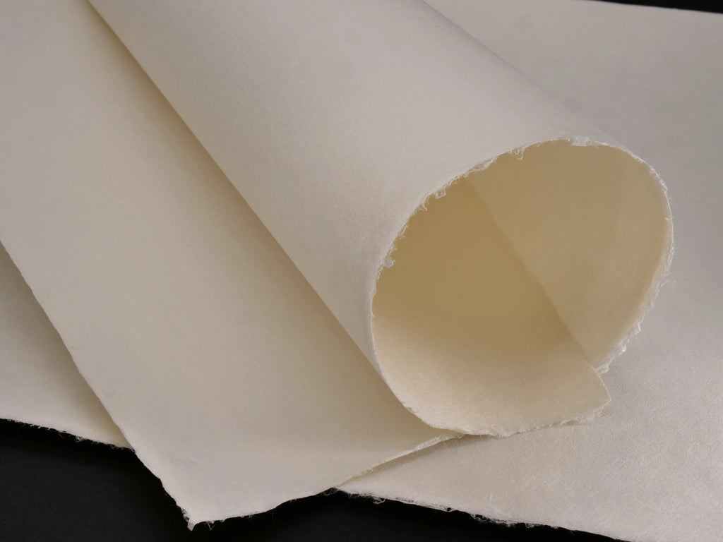 Uwa Senka Heavy - Sized. A beautiful, heavy, small format paper with deckle edges. This paper is unbleached and instead lightened using the 'gas sarashi' method. At 110g it is twice the usual Weight of Uwa Senka.  A good choice for printmaking (including lithography, monoprint and relief printing), painting, sumi-e and dyeing. Great for mokuhanga because it is sized.