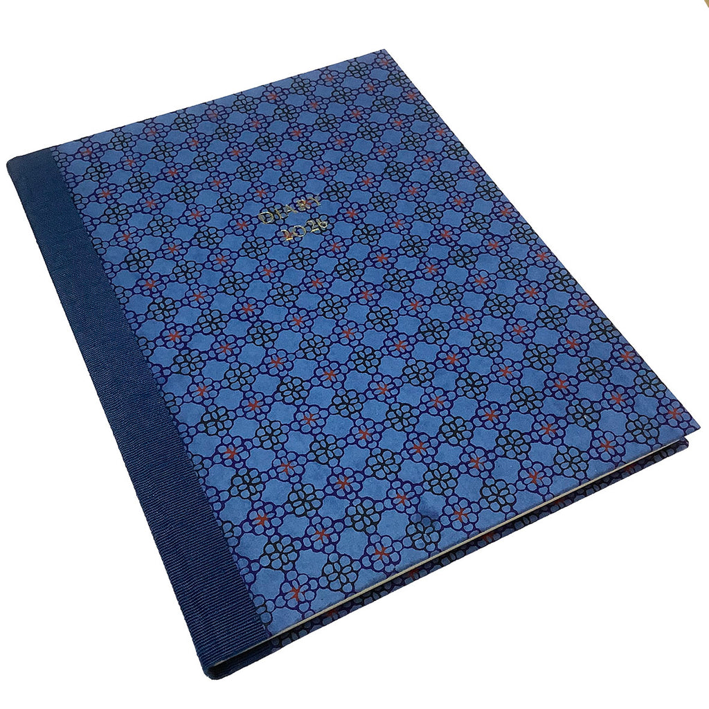Beautifully bound in Japanese hand stencilled Katazome-shi paper with a linen cloth spine, grosgrain ribbon marker and gold tooling to the front.